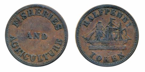 Breton-919. PE-7C4. 1857. P.E.I. ICCS Very Fine-30. (2 pcs.); Breton-921. PE-921. PE-8A1. Fisheries and Agriculture. Half Penny. ICCS Very Fine-20. Lot of three (3) tokens.