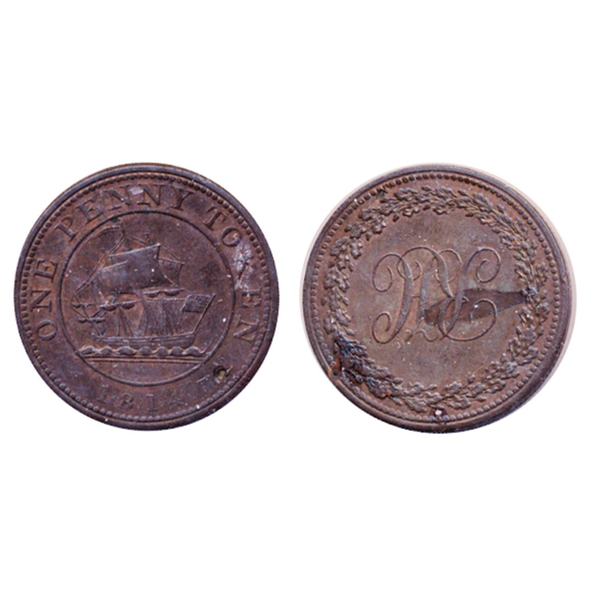 Breton-989. LC-52. One Penny Token. 1814. R.H. Punch mark on obverse, flaw on reverse. EF.