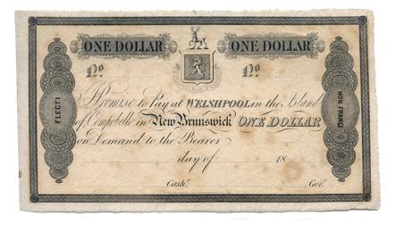 CAMPOBELLO MILL AND MANUFACTURING CO. Welshpool, Island of Campobello, N.B. $1.00. 18--. (Issue of 1839). A Remainder, with only light foxing keeping this rare scrip from the uncirculated category. AU