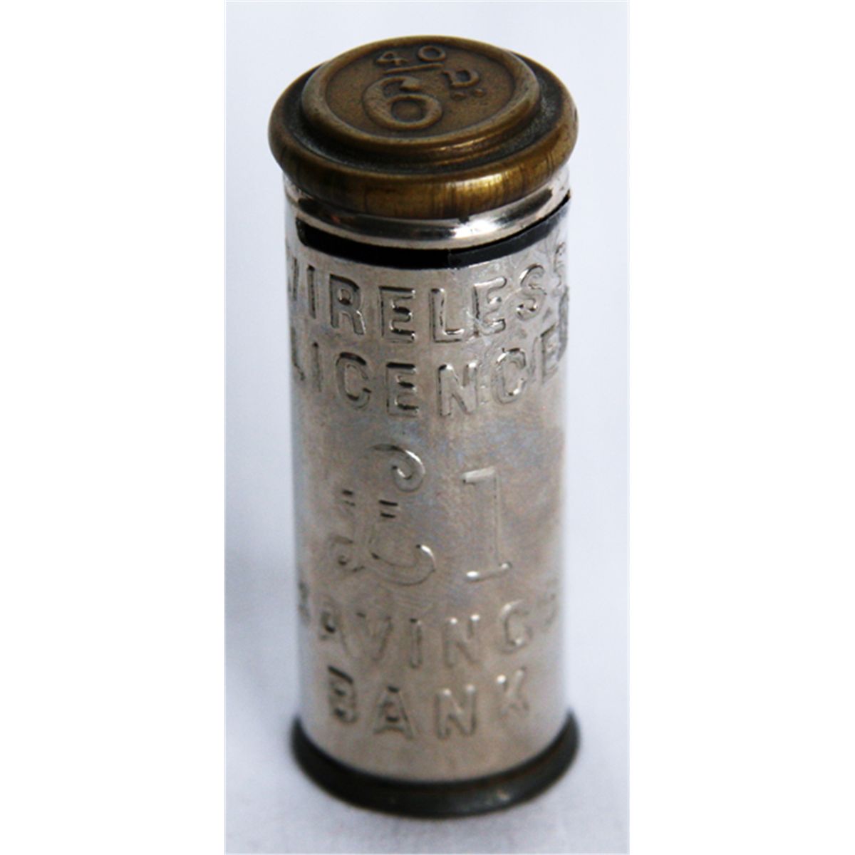 COIN TUBE. ‘WIRELESS LICENSE & SAVINGS BANK’ on side. 6d. (six pence). 2cm x 5cm. Nickel plated finish. No serial number, key lock or patent information. VF.