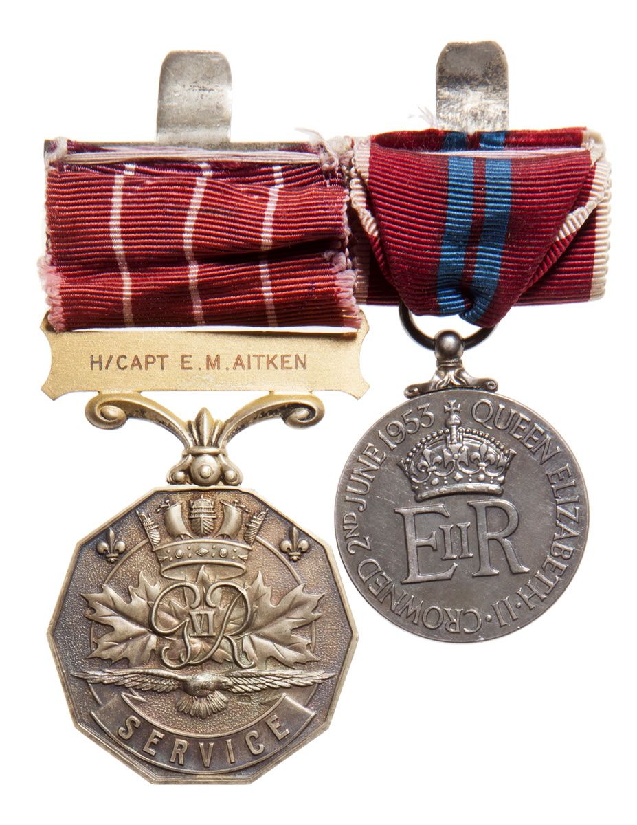 WWII Canadian Air Force Service medal named H/CAPTAIN E.M. AITKEN, court-mounted with 1953 Coronation medal. Extremely Fine. Lot of two (2) pieces.