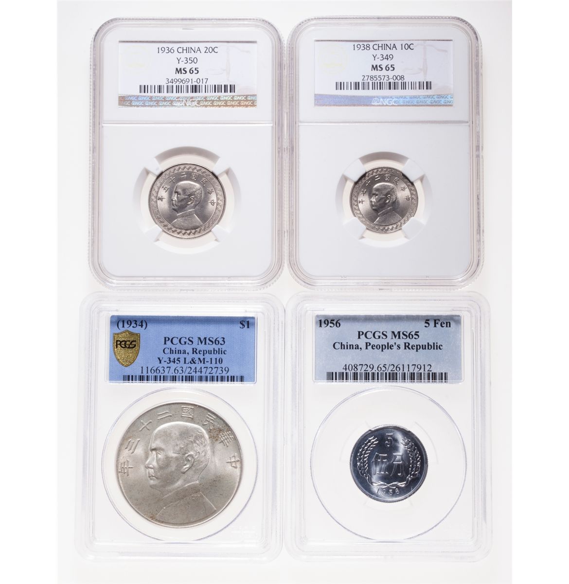 China. Lot of four (4) certified coins, including: 1956 5 Fen, PCGS MS-65; 1938 10 cents, Y#349, NGC MS-65; 1936 20 Cents, Y#350, NGC MS-65; 1934 Dollar, Y#345, L&M-110, PCGS MS-63.