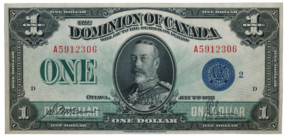 DOMINION OF CANADA. $1.00. July 2, 1923. DC-25h. No. A5912306/D. Blue Seal. McCavour-Saunders. A select Unc.