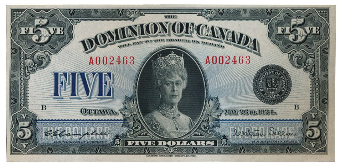 DOMINION OF CANADA. $5.00. May 26, 1924. DC-27. No. A002463/B. Signed Campbell-Sellar. An excellent example of the popular Queen Mary note. Bright AU.