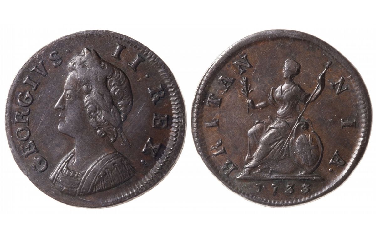Farthing 1733. George II 1733. ICCS graded About Unc-50. Possibly over horizontal 3.