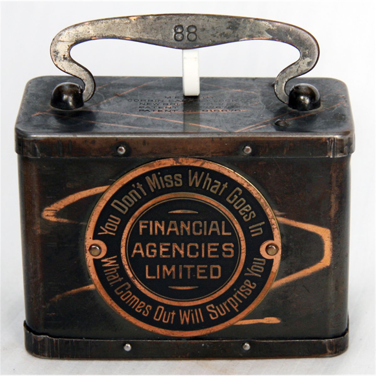 FINANCIAL AGENCIES LIMITED. ‘YOU DON’T MISS WHAT GOES IN..’ A steel satchel bank, with rounded corners. Coin slot at right, with banknote hole at left. Handle at top. Key lock, with key present. Serial Number 88. 9cm x7cm x 5cm. Japanned steel. (Swirl-like finish). Maker- Corbin Cabinet Lock Co., New Britain, CT. USA. Patent No. 916676. VF.