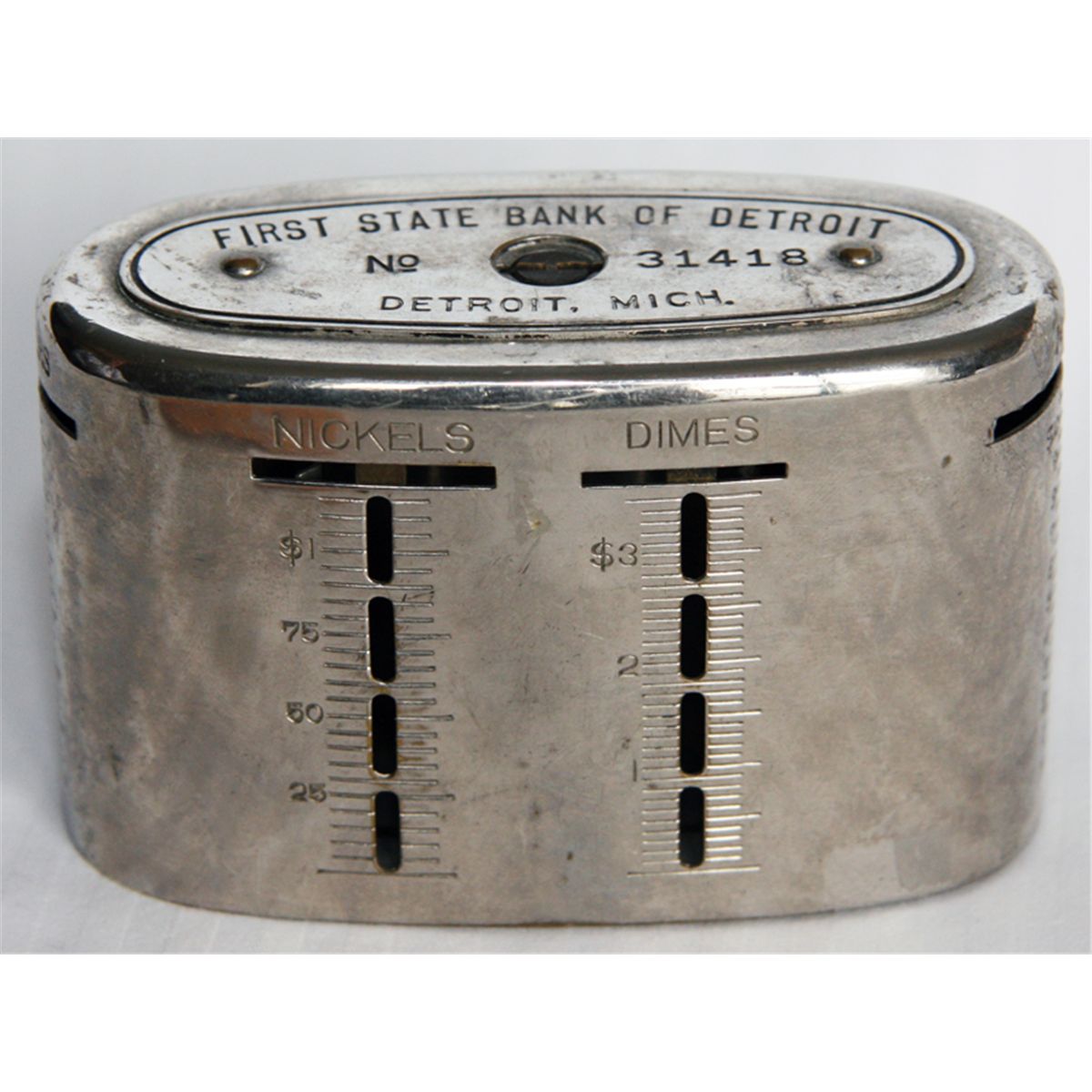 FIRST STATE BANK OF DETROIT, DETROIT, MI. An oval ‘Savings Teller’ bank. Also known as ‘The Travelling Teller’. Slots arranged horizontally along top edge for 1, 5, 10, 25, 50 Cents and Currency. Holes also arranged vertically to show the money saved. No handle. Key lock, with key present. Serial number 31418. 9cm x 6cm x 4cm. Nickel plated. Bank name on nickel plate attached to top. Maker-The Automatic Recording Safe Co., Chicago, IL., USA. Patented. Apr. 26, 1904, July 4, 1905, Apr. 25, 1911, Sept. 9, 1913, Sept. 23, 1913. VF.