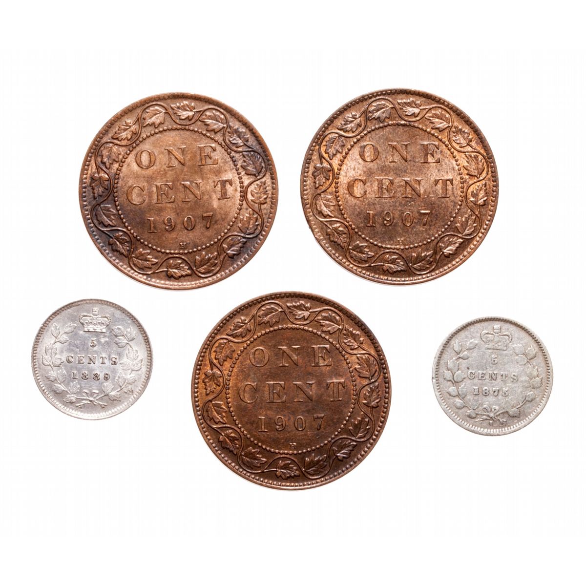 Five Cents. 1875-H. VG-8; 1889. AU-55; One Cent. 1907-H. VF-30 to EF-45. (3 pcs.). All with some luster. Total of five (5) key dates.