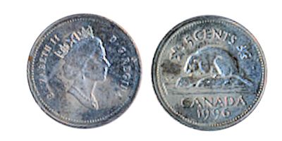 Five Cents. 1996. A misaligned die error. The reverse is centered, the obverse is off-center 5%.