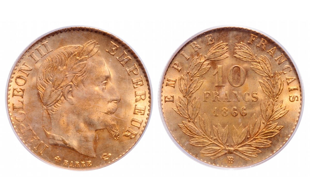France. 10 Francs. 1866-BB. Gold, .900, 3.2258g, AGW 0.0933 oz. PCGS graded Superb Gem Uncirculated-66.