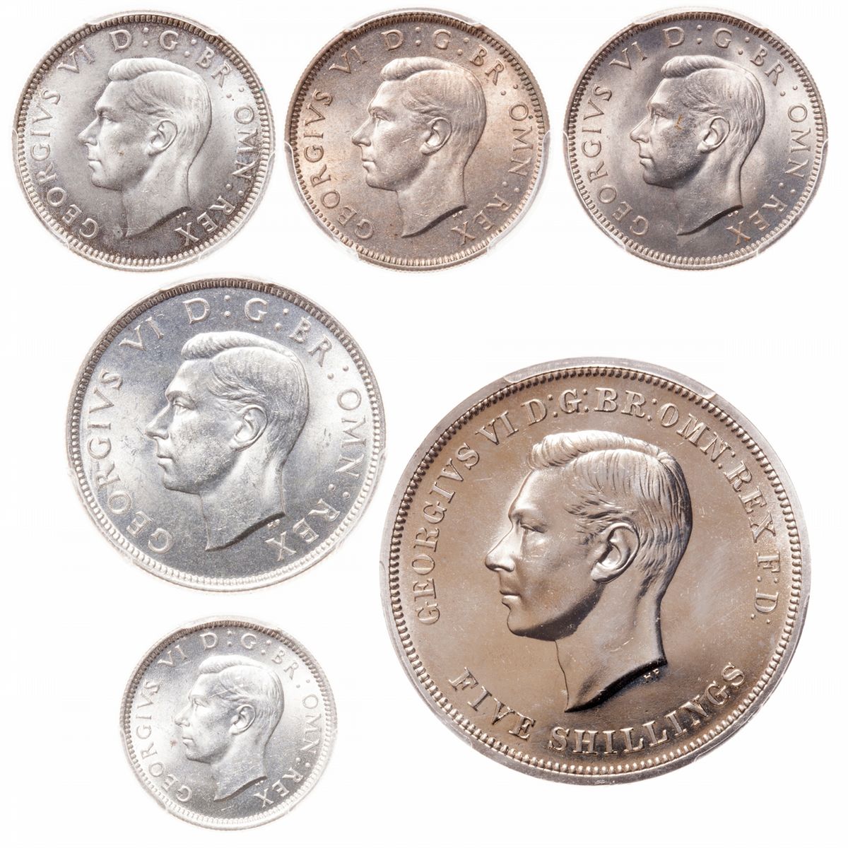 Great Britain. Lot of six (6) PCGS graded George VI coins, including: 1945 6 Pence, MS-63; 1940 Shilling, Scotland reverse, MS-65; 1949 Shilling, England reverse, MS-64+; 1951 Shilling, England reverse, MS-65; 1944 Florin, MS-64; 1951 Crown, PL-64.