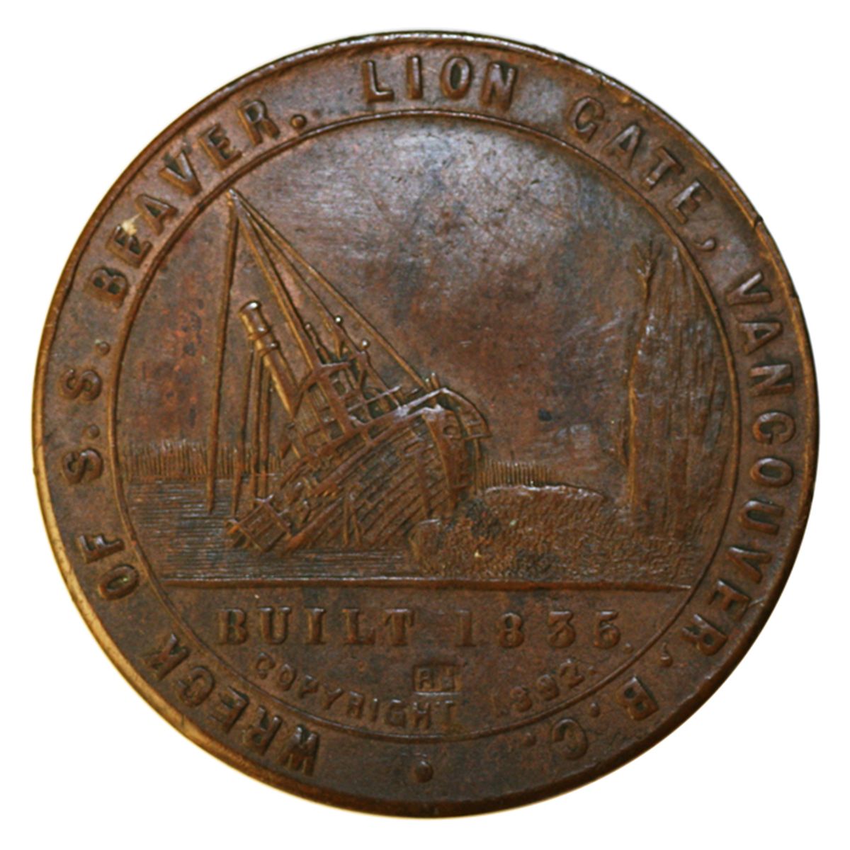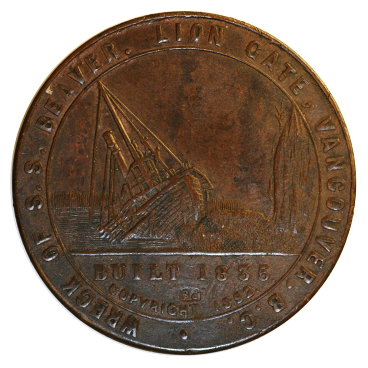 H.B.C. S.S. Beaver souvenir medal by C.W. McCain. 1892. AE. 42mm. Edge serial-numbered 420. Ler. Supp. 1581. VF+. The S.S. Beaver was built in 1835 and wrecked in 1892.