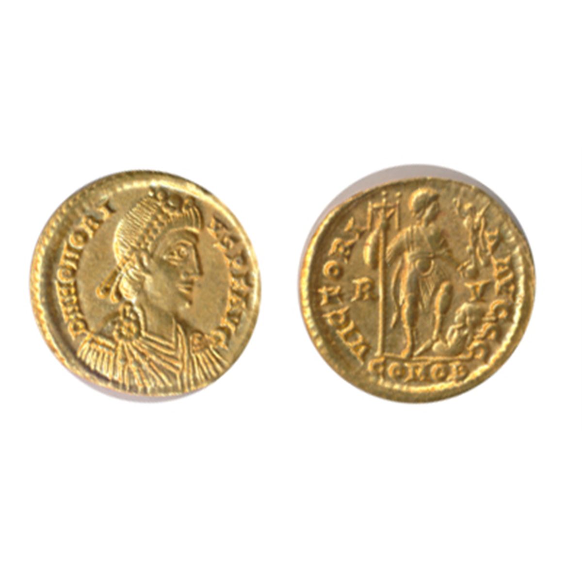 HONORIUS. AD 393-427. Gold Solidus (4.39 g.) Ravenna. Obv: Bust, right. RIC-1323. Good Very Fine.