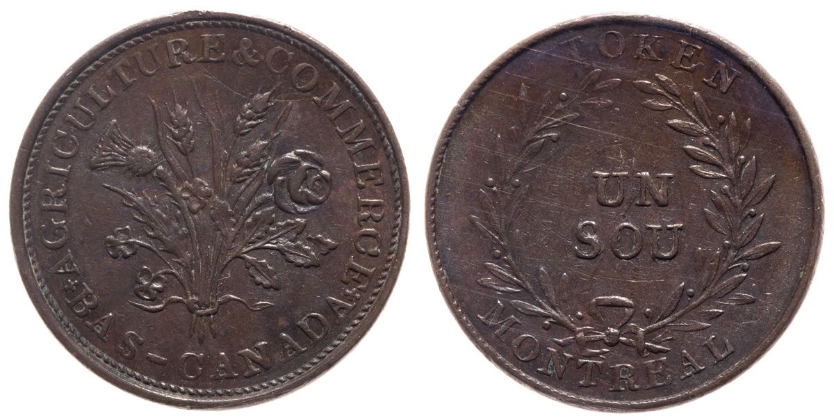 token Breton-710. LC-38A. Obverse French legend; Token Montreal Un Sou – Agriculture & Commerce Bas-Canada; Reverse wreath with thirty-nine laurel leaves; Obverse bouquet with three shamrocks; no bow. ICCS graded Unc-60.