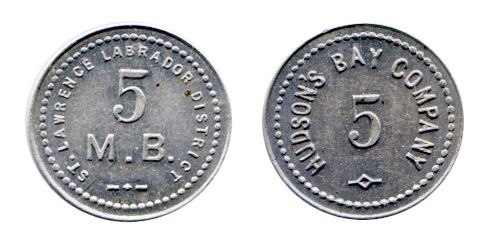 Hudson’s Bay Company. St. Lawrence Labrador District. 5 M.B. token. Gingras-260a. Alum. Small lettering. EF.