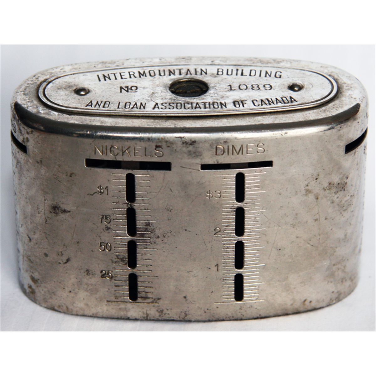 INTERMOUNTAIN BUILDING AND LOAN ASSOCIATION OF CANADA. An oval ‘Savings Teller’ bank. Also known as ‘The Travelling Teller’. Slots arranged horizontally along top edge for 1, 5, 10, 25, 50 Cents and banknotes. BANKNOTE HOLE ON BOTTOM. Holes also arranged vertically to show money saved. No handle. Key lock, with key present. Serial number 1089. 9cm x 6cm x 4cm. Nickel plated. Maker-The Automatic Recording Safe Co., Chicago, USA. Patented Sept. 13, 1913, Sept. 23, 1913. VF.