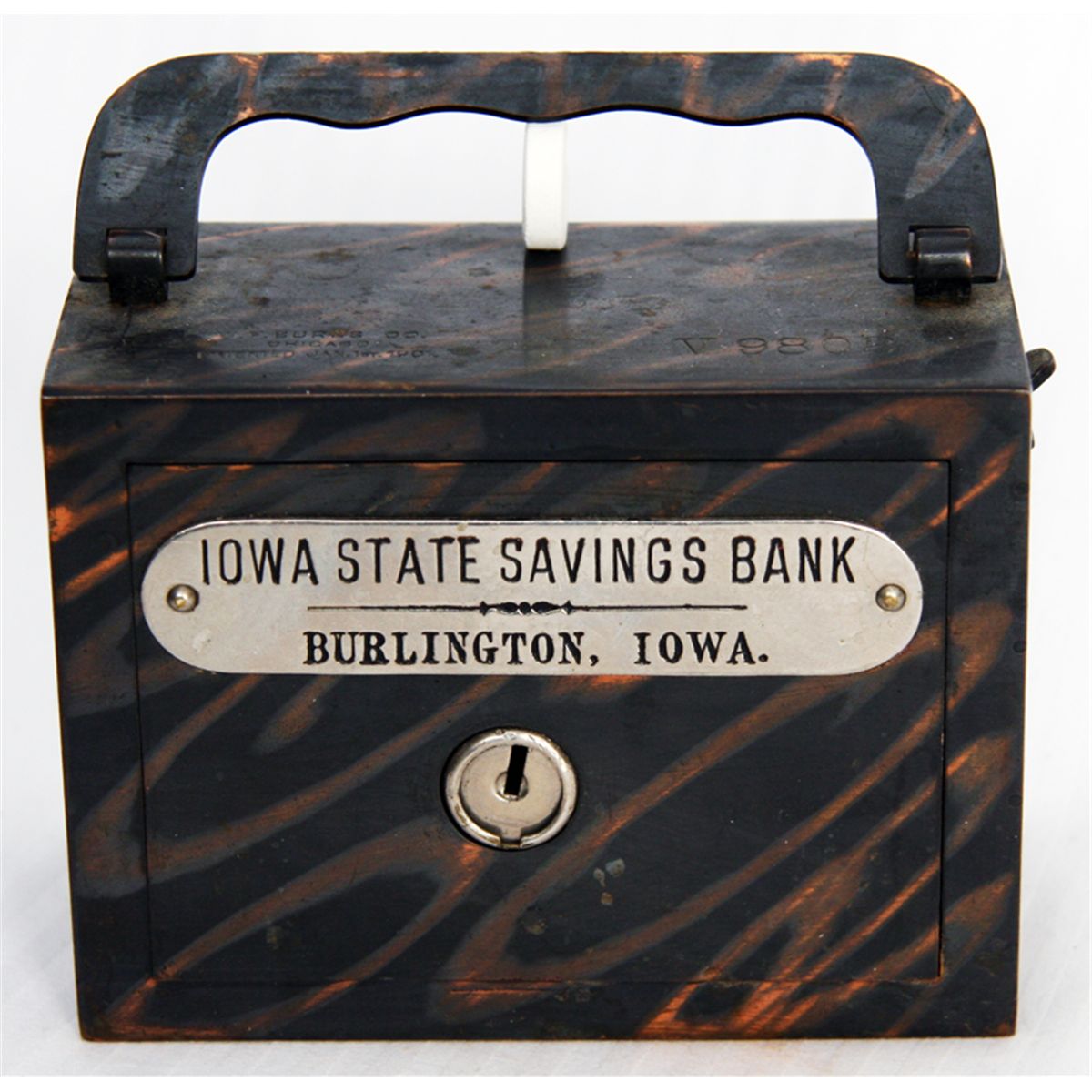 IOWA STATE SAVINGS BANK, BURLINGTON, IOWA. A steel satchel bank, with square corners. Coin slot at right. Banknote hole at left. Handle at top. Key lock, with key present. Serial number V9802. 11cm x 8 1/2cm x 6cm. Japanned steel. (Swirl-like finish). Also known as ‘The Deposit Developer’. Maker- W.F. Burns Co. Chicago. Pat. Jan. 1, 1901. VF.