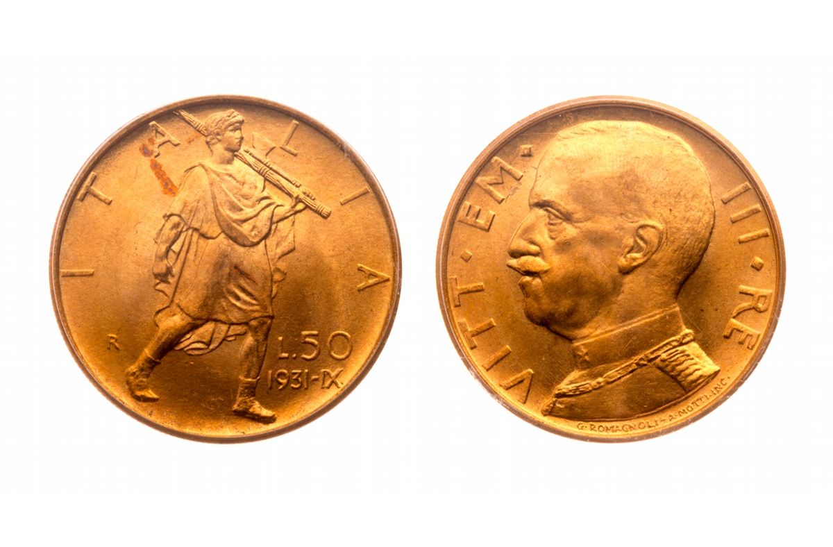Italy. 50 Lira. 1931 R. Year IX, Gold, .900, 4.3995g, AGW 0.1273 oz. PCGS graded Superb Gem Uncirculated-66.