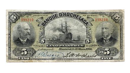LA BANQUE D'HOCHELAGA. $5.00. Mar. 1, 1907. CH-360-18-04. CCCS graded Fine-15. Only four examples known. Worth a premium bid.