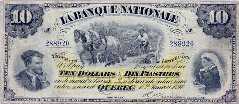 LA BANQUE NATIONALE. $10.00. Jan. 2, 1897. CH-510-20-06. No. 288920/A. lines. PMG graded Choice Fine-15.