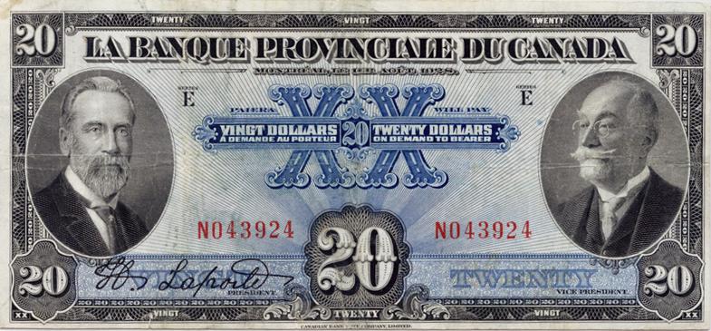 LA BANQUE PROVINCIALE DU CANADA. $20.00. 1 Aout, 1928. CH-615-14-18. No. N043924. PMG graded Very Fine-25.