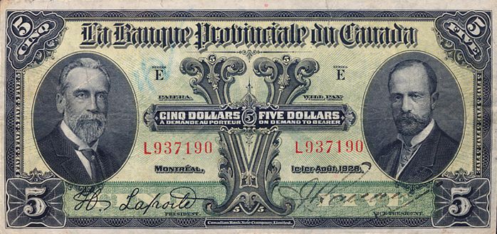 LA BANQUE PROVINCIALE DU CANADA. $5.00. 1 Aout 1928. CH-615-14-08. No. L937190. PMG graded Very Fine- 25. Net. Designated with a ‘tear and annotation’.