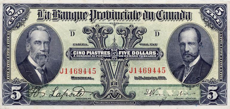 LA BANQUE PROVINCIALE DU CANADA. $5.00. Jan. 31, 1919. CH-615-14-06. No. J1469445. PMG graded Very Fine-25.