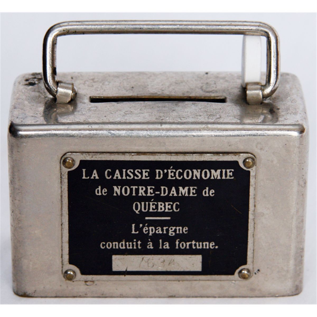 LA CAISSE D’ECONOMIE DE NOTRE-DAME DE QUEBEC. A small rectangular steel satchel bank. Coin slot on top, banknote hole at right side. Handle at top. Key lock. No key present. Serial number 7634. 8cm x 5 1/2cm x 4 cm. Nickel plated with a black face plate attached to front. Maker-Automatic Recording Safe Company, Chicago, USA. Patents pending. Made in USA. VF.