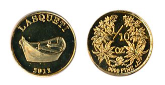 LASQUETI MINT. 1/10 Ounce. 2011..9999 Gold. Obv: Dory. Rev: Herb plants. #43. Gem Proof.