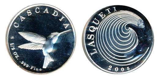 Lasqueti Mint. 1997/2007. Obv: LASQUETI/1997/2007. Frog. Rev: CASCADIA. 1/2 oz. .999 Fine. Hummingbird. Silver. 30 mm. CCCS graded Proof-66. Ultra Heavy Cameo. Hard plastic holder. No. 91 of 150 minted.