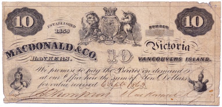 MACDONALD & CO. $5.00. Sept. 6, 1863. CH-420-10-06. No. 823. Signed Thompson-Macdonald. BCS graded Fine-12. Minor chinks missing at upper right corner and a few pin holes.