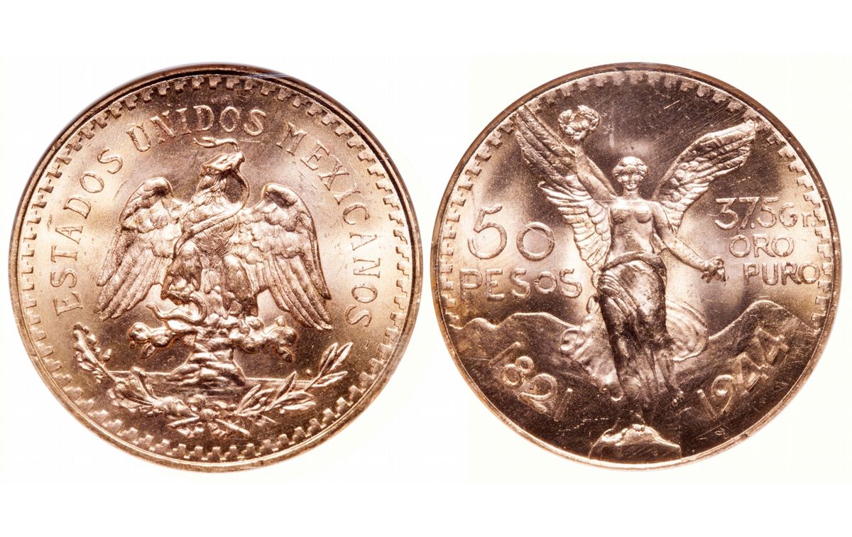 Mexico. 50 Peso. 1944. Gold, .900, 41.6666g, AGW 1.2057 oz. NGC graded Superb Gem Uncirculated-66. Wings Designation.