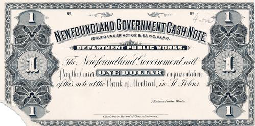 NEWFOUNDLAND GOVERNMENT CASH NOTE. $1.00. NF-5P. 1901-1909. A Face Proof on thin paper. A 3/4" by 1/2" piece have been torn from the lower left corner.