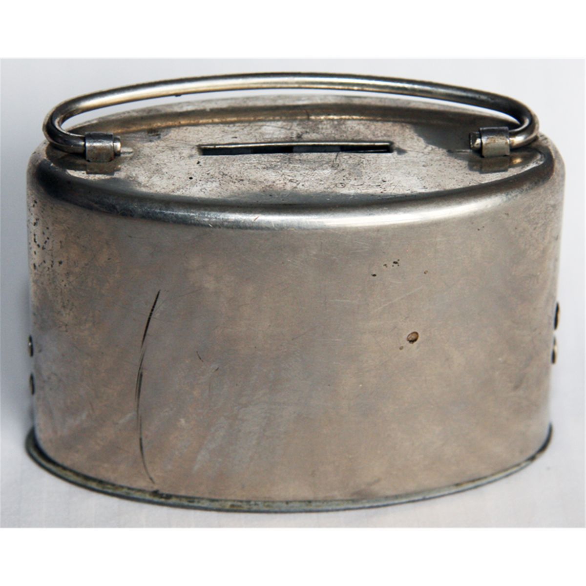 NO Name. Plate Removed. Oval steel satchel bank. Coin slot on top. Handle present. Key lock, but no key present. Serial number 38258. 9cm x 6cm x 4 1/2cm. Nickel plated steel. Maker-Stronghart Co., Chicago, USA. No patent information. Also known as ‘The Portable Safe’. Original white box of issue included. Fine.