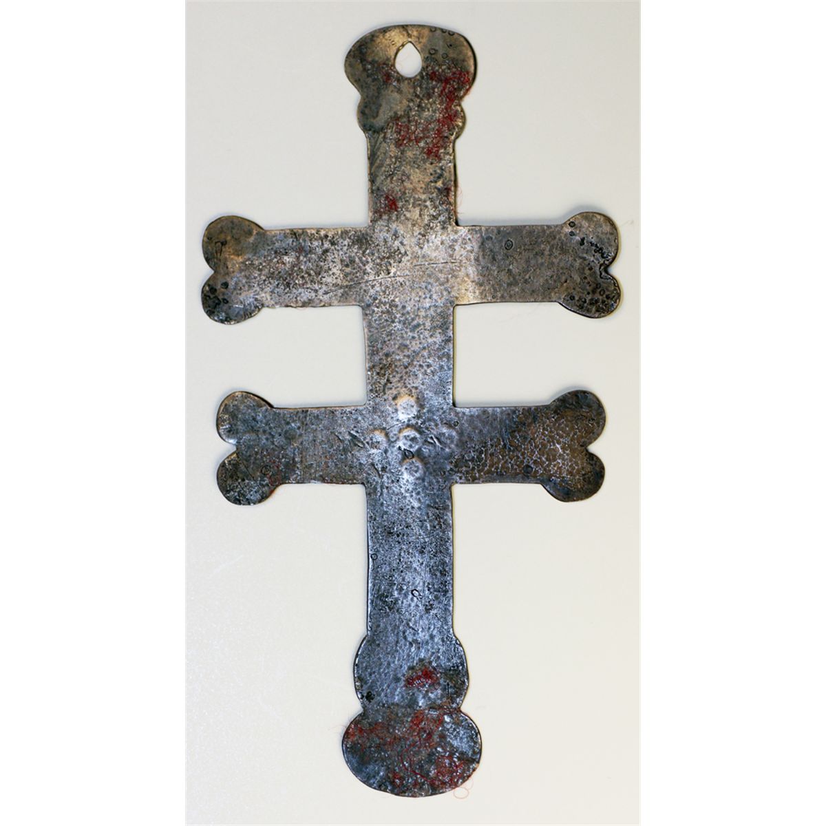 NORTH AMERICAN INDIAN TRADE SILVER CROSS. A Double Bar Lorraine silver Trade Cross. 90mm x 49mm. Holed at top, with simple designs on the front of the cross. Stamped HB (Hudson’s Bay?) at bottom. 8.0 gms.