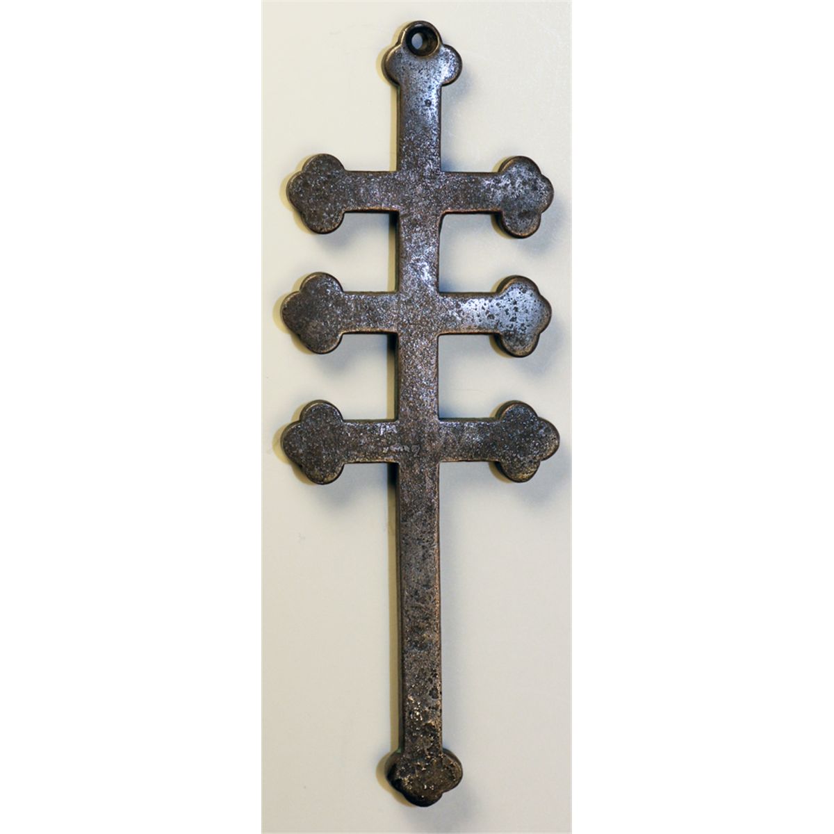 NORTH AMERICAN INDIAN TRADE SILVER CROSS. A rare Triple Bar silver Trade Cross. 88mm x 31mm. 45.4 gms. Holed at top, with simple designs on front of cross. Stamped ‘C.A.’ possibly for Charles Arnoldi, 1779-1810, Montreal.