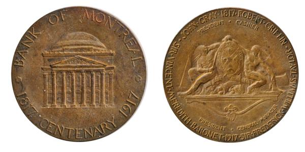 Obv: BANK OF MONTREAL/1817 CENTENARY 1917. Building; Rev: Shield, with two Indians. Copper. 34mm.