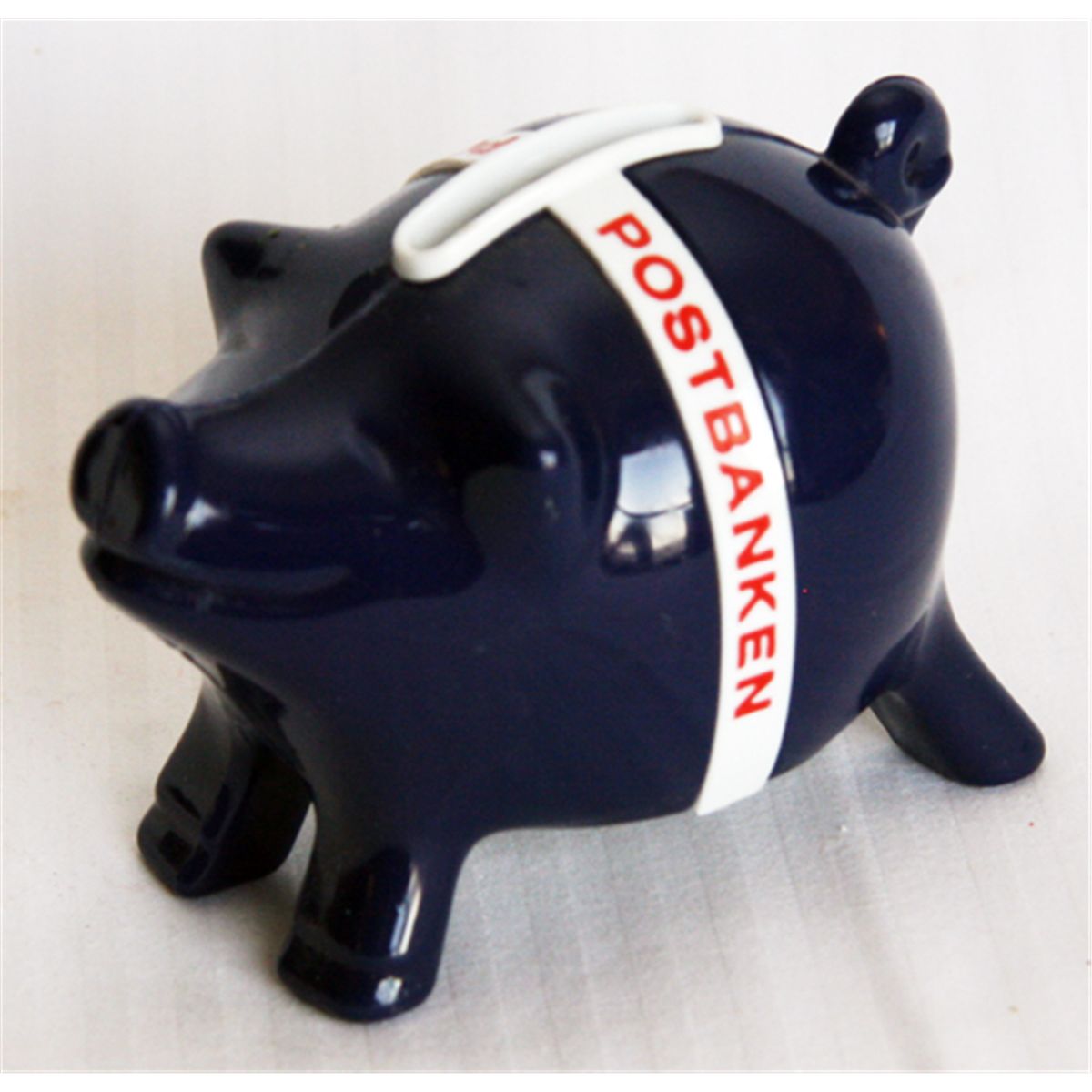 POSTIPAUKKI. Piggy Bank shaped. Black plastic with a white band. Coin slot on top. 6cm x 7cm x 10cm. EF.