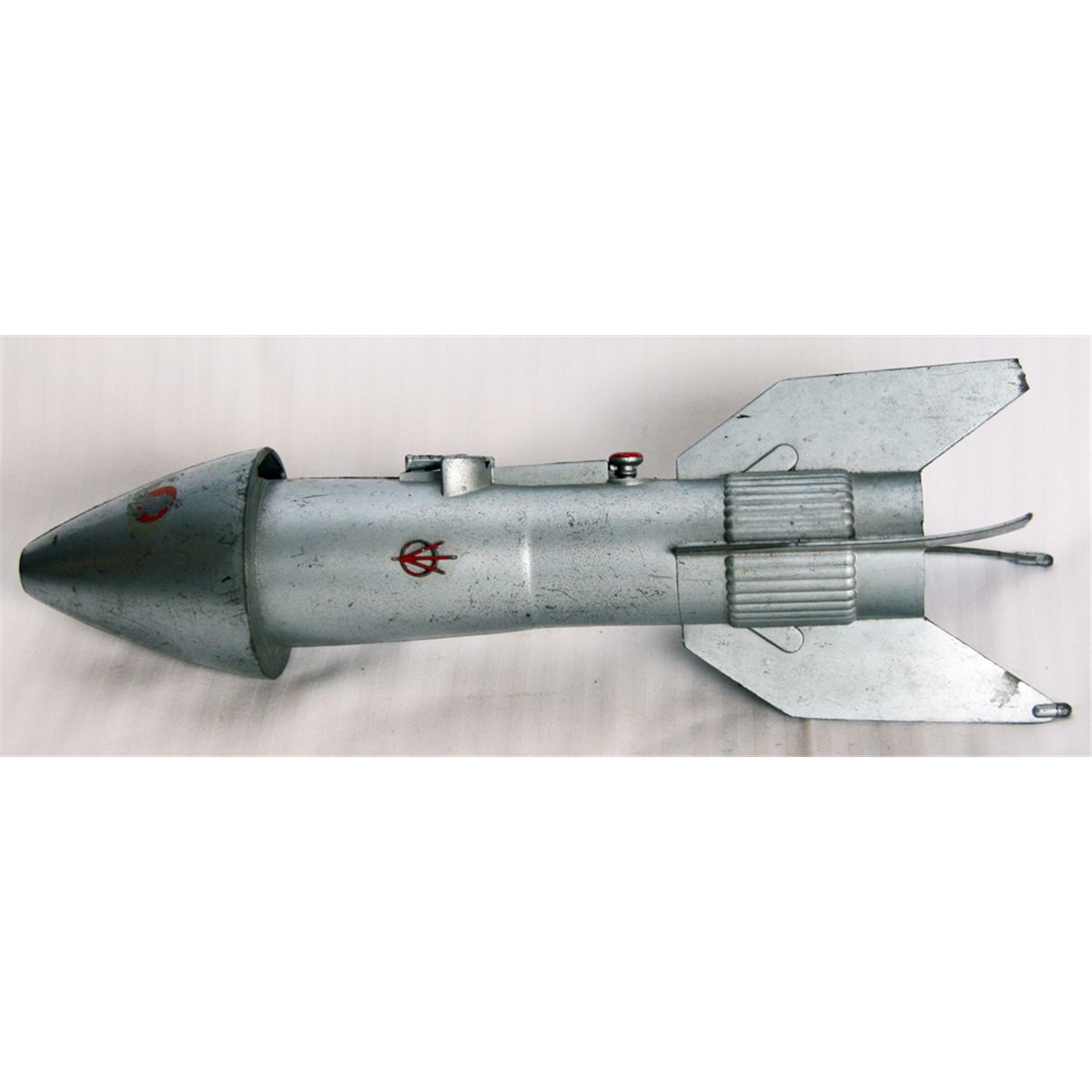 SAVINGS AT YOUR CREDIT UNION. A Rocket shaped Mechanical bank. A small catapult shots coin into slot on top. K707 x B703 x 29cm tall. Steel with a silver finish. Maker- 1957 H. Balzac Creaton. Can. Pat. 150-214B2. Fine. Two rocket fins damaged.