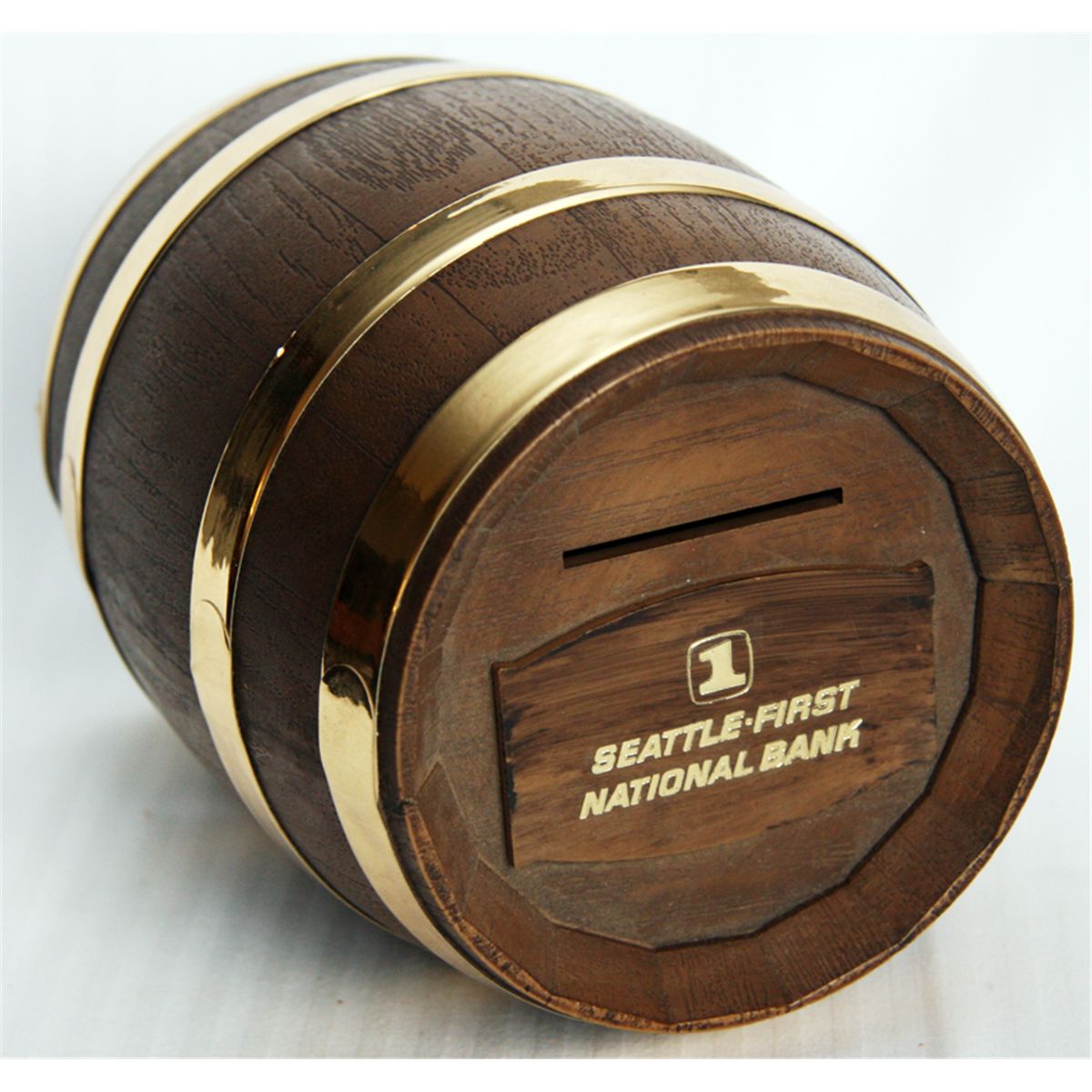 SEATTLE-FIRST NATIONAL BANK. Wine Barrel shaped. Coin slot on top. A wood appearing, plastic bank, w