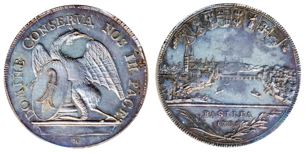 SWITZERLAND. Canton coinage. Basel. Thaler. 1785H. Dav-1755. KM#179. Obv: City view and date below assorted shields. Rev: Winged dragon with Arms of Basel. Extra Fine.