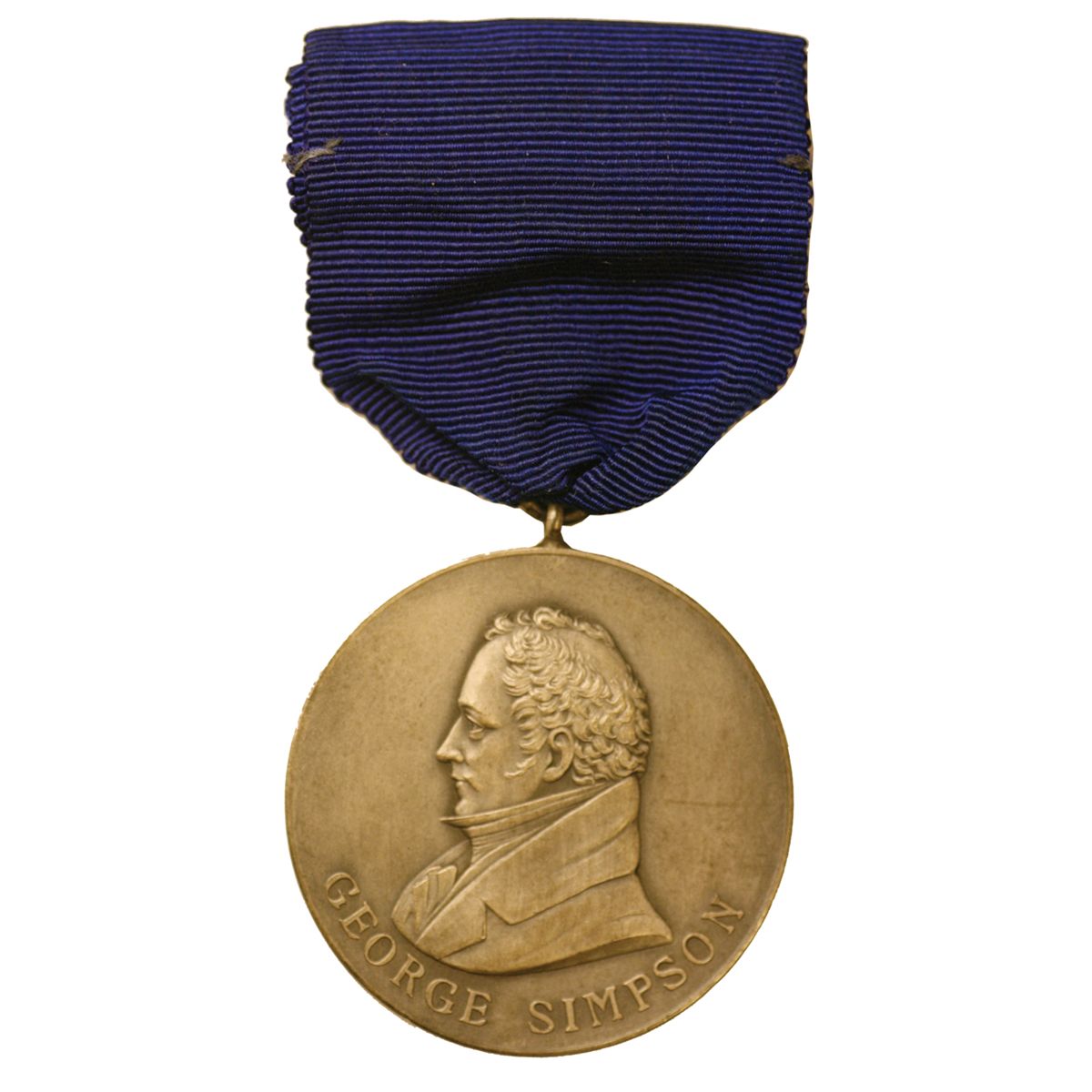 (Sir) George Simpson/Fort St. James medal. AR. 39mm. With blue ribbon and hanger marked Elkington. (London, England). Gingras-140a. Fifty struck in silver. Commemorative of the centennial of Simpson’s trip from York Factory to the Pacific coast. Purchased from Warren Baker, Aug. 28, 1984. No case. AU. Note: The medals were given to employees, guests and leading Indians at Fort St. James to commemorate the centennial of Simpson’s trip, and may this be considered as part of the series of medals relating to North American Indians.