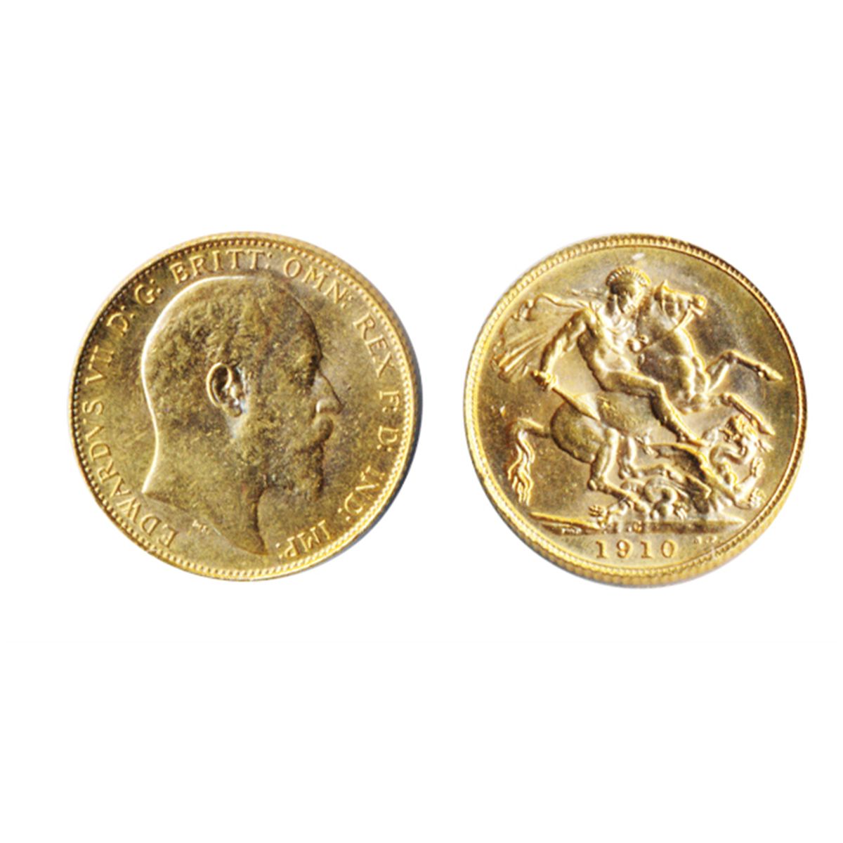 Sovereign. 1910-C. AU-55. Brilliant, lustrous yellow golden luster.