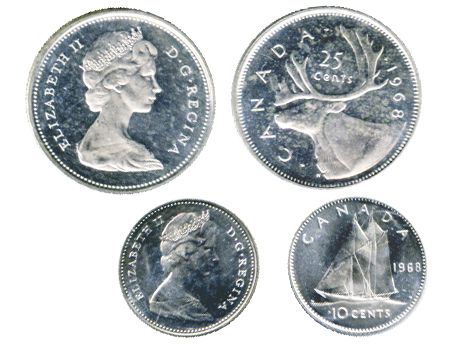 TEN CENTS. 1968 Silver. ICCS Proof-Like-64. Brilliant. TWENTY-FIVE CENTS. 1968. Silver. Proof-Like-63. Heavy Cameo. Both brilliant.