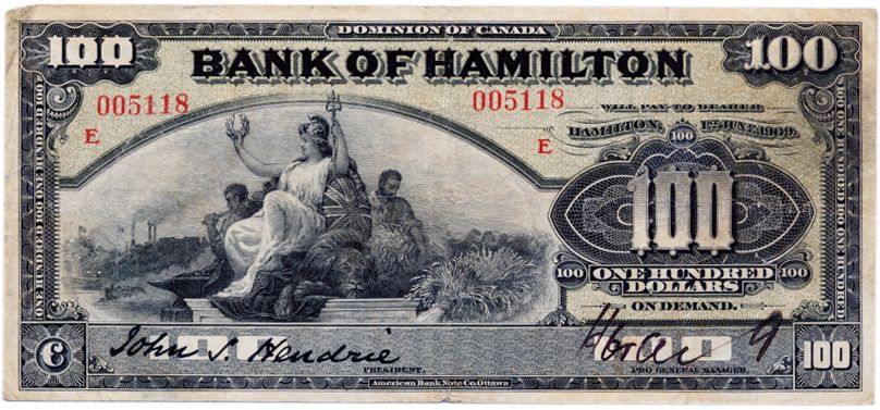 THE BANK OF HAMILTON. $100.00. June 1, 1909. CH-345-0-26. No. 005118. “E...E” overprint in red. PMG graded Fine-15. Another high denomination rarity.