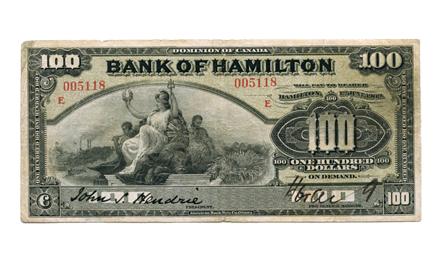 THE BANK OF HAMILTON. $100.00. June 1, 1909. CH-345-20-26. 'E…E' overprinted in red. No. 005118. A bright Fine, and perhaps the finest known example in private hands.