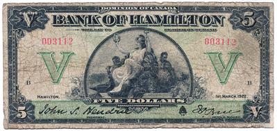 THE BANK OF HAMILTON. $5.00. 1 March, 1922. CH-345-22-02. No. 003112. PMG graded Very Good-10. Believed to be nine examples known.