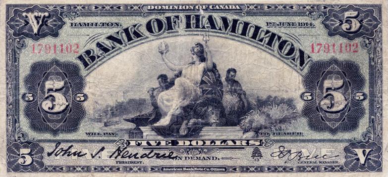 THE BANK OF HAMILTON. $5.00. June 1, 1914. CH-345-20-08. No. 1791102. PMG graded VG-10.