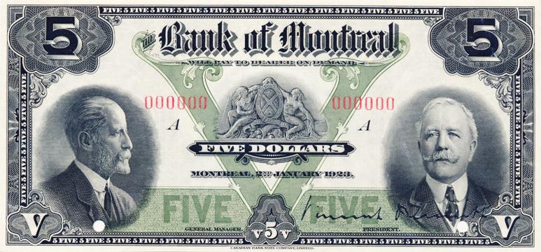 THE BANK OF MONTREAL. $5.00. Jan. 2, 1923. CH-505-56-02P. A Specimen. PCGS graded Choice AU-58. PPQ.