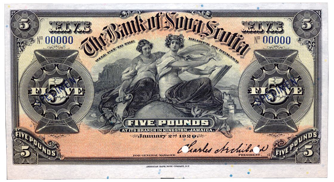THE BANK OF NOVA SCOTIA. Kingston, Jamaica. Five Pounds. Jan. 2, 1920. CH-550-38-02-08S. No. 00000. A full colour Specimen. PCGS graded Gem Unc-66. PPQ.